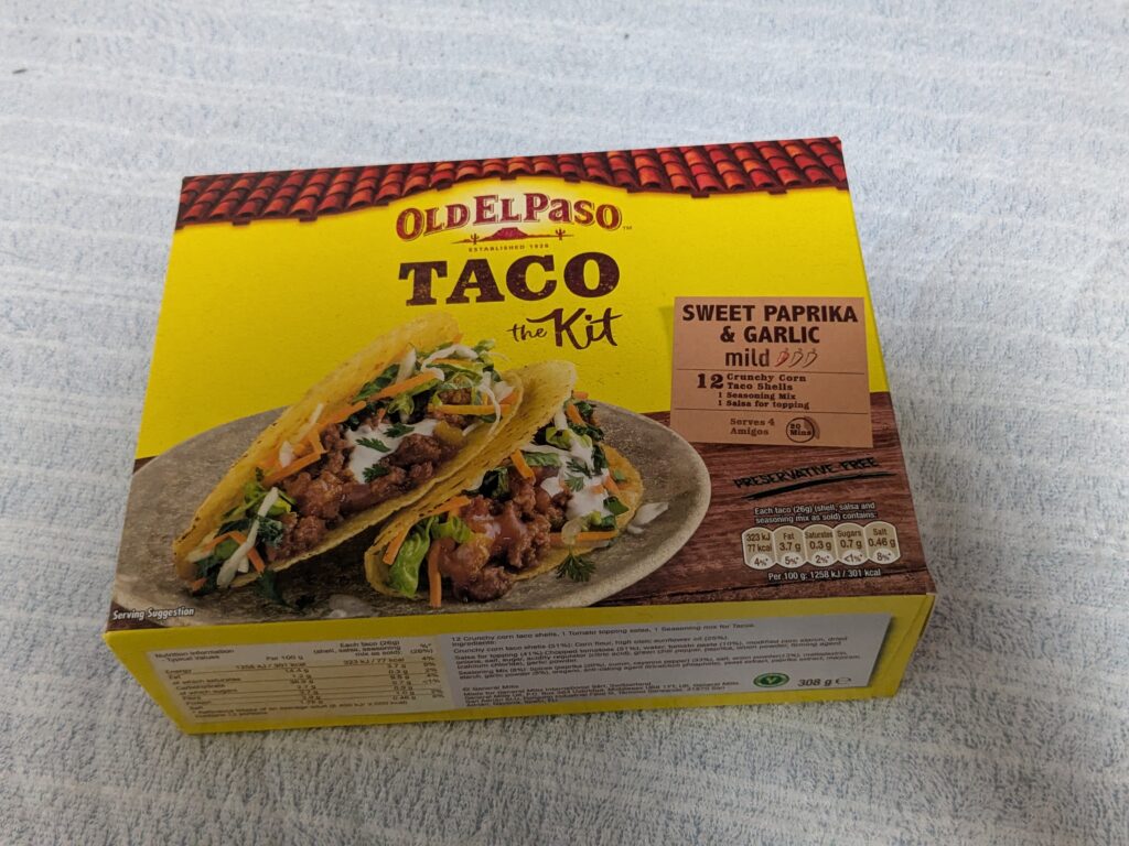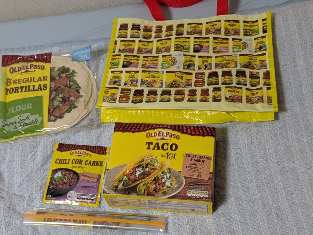 続いてこちら、タコスキット。パリパリのタコシェルとマイルドタコソース(タコスを食べる前にかけると美味しくなる)とタコシーズニングが入っている。これ一つと挽肉、お好みの具(おすすめはオニオン、チーズ、トマト、ハラペーニョ)さえあればお手軽にタコスを始められる。ちょうど明日(2025/11/22)から三連休なので、友人を呼んでタコパしちゃうのもあり。