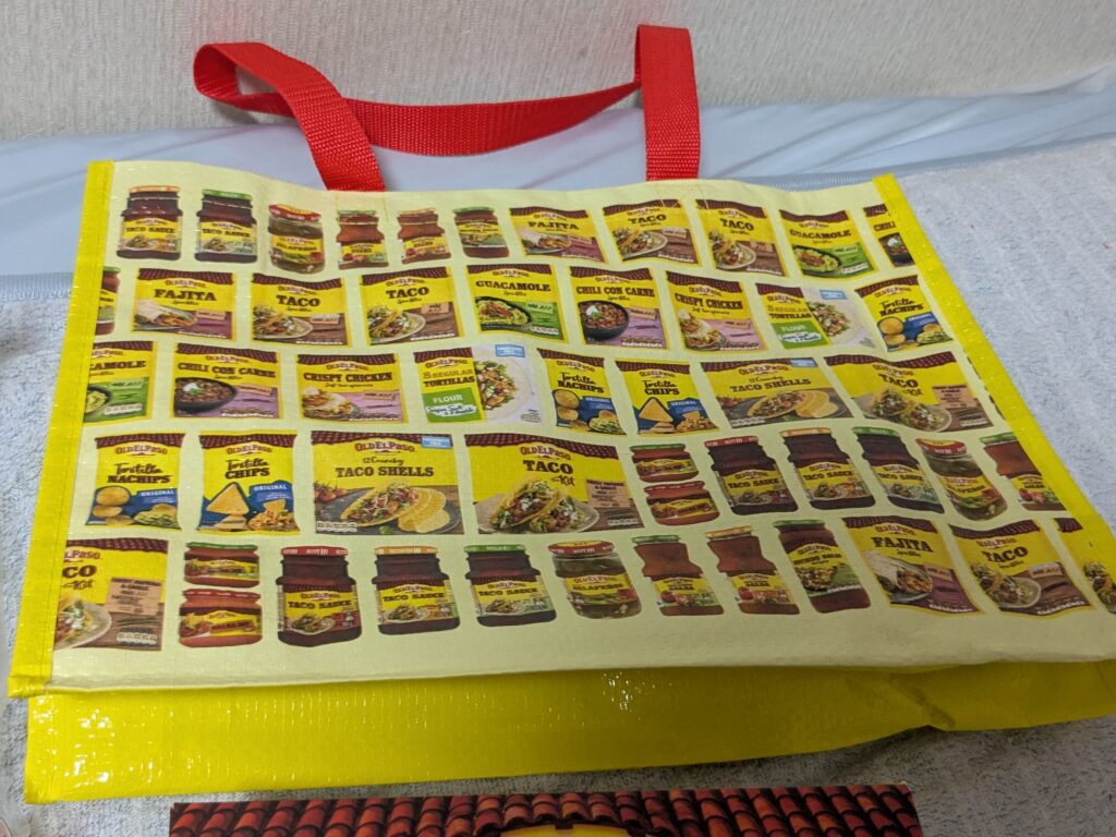 メキシカンハッピーバッグだ。お値段1,100円(税込)中身はチリシーズニング、フラワートルティーヤ、タコスキット、保存袋の4つとそれを内包しているオリジナルデザインのバッグだ。このメーカーのタコスキットでタコスのおいしさを知ったので、感謝の思いも込めて開封…