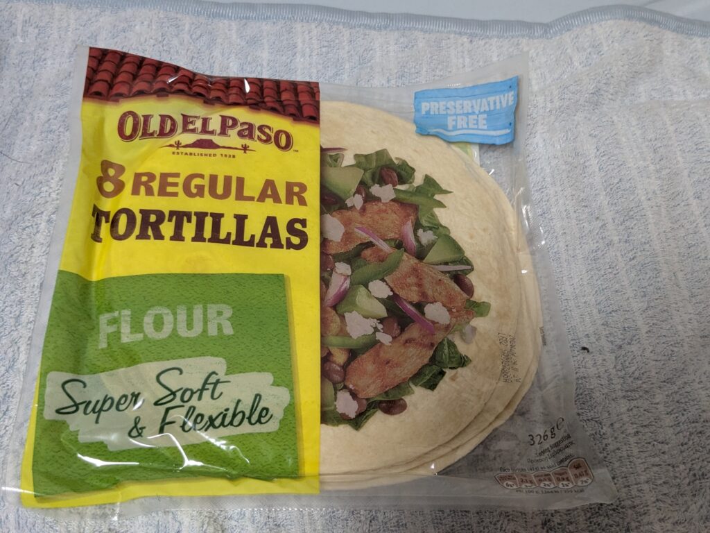 続いてこちら、フラワートルティーヤ。小麦でできたトルティーヤで、タコスはもちろんあらゆる物を包んで食べられる。これにタコミートと生の刻んだオニオン、ライム系の柑橘類とタバスコをかけるだけで優勝できます。楽しいですよ。